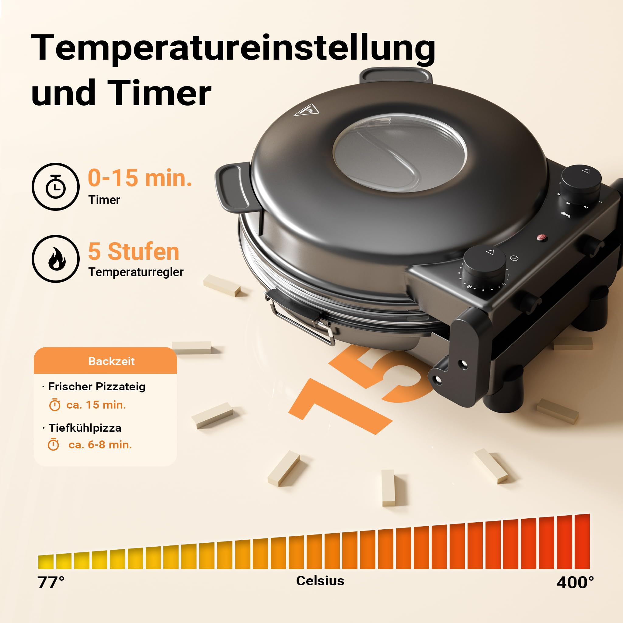 Pizzamaker mit Keramiksteinplatte Ø32cm und Sichtfenster, zwei Heizelemente max. 400°C, mit Timer
